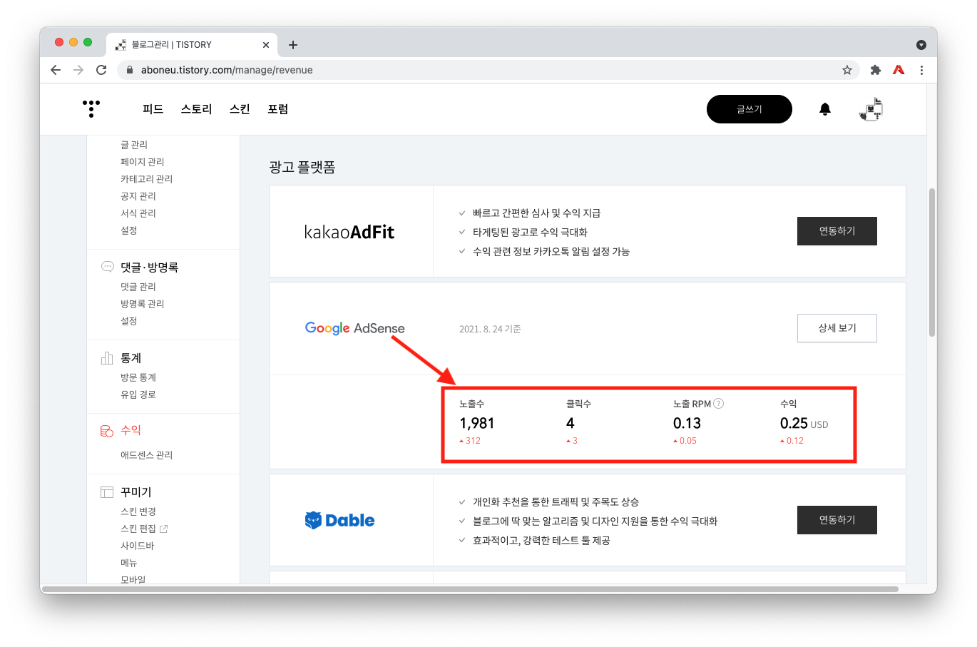 연동이 완료되면 애드센스의 통계 및 수익 정보가 바로 노출됩니다.