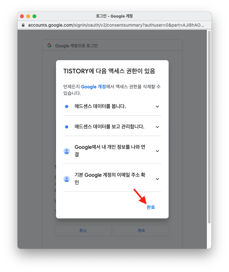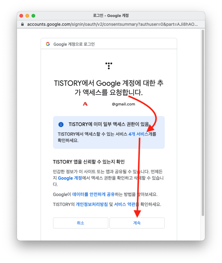 TISTORY에서 Google 계정에 대한 추가 액세스를 요청합니다. > 4개 서비스 권한 > 계속 클릭