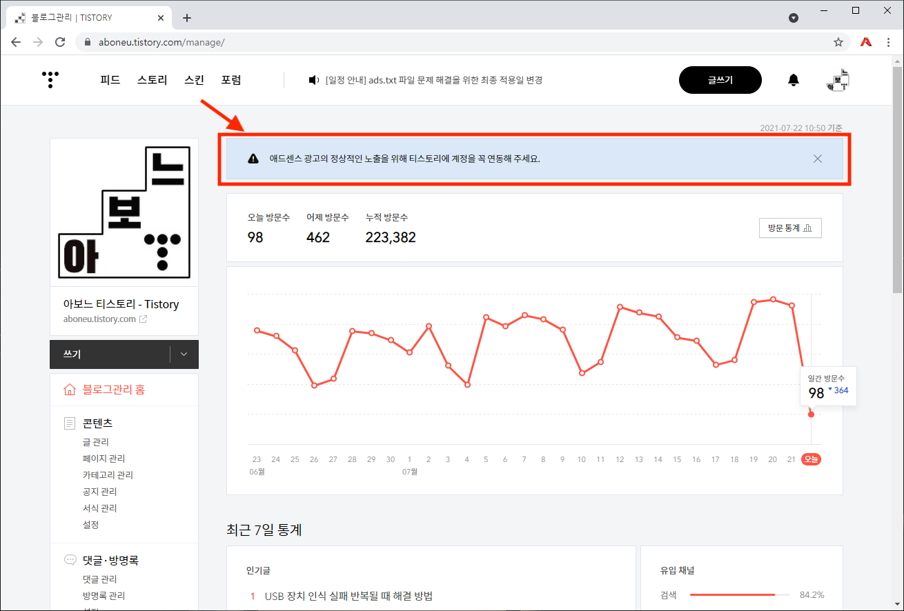 '애드센스 광고의 정상적인 노출을 위해 티스토리에 계정을 꼭 연동해 주세요.' 라는 알람이 뜹니다.