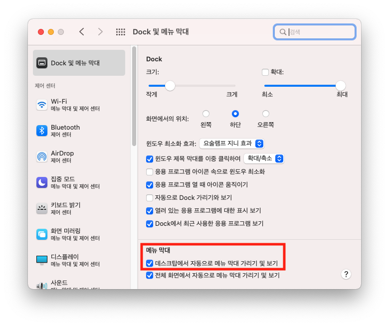 시스템 환경설정 > Dock 및 메뉴 막대 클릭