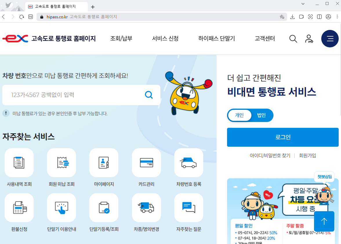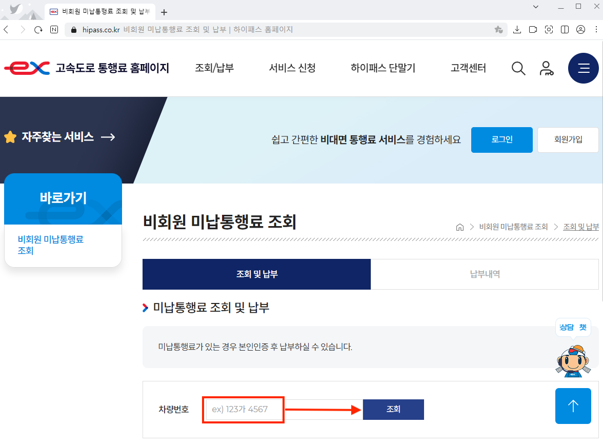 상단 메뉴 '조회/납부' > 미납통행료 > '비회원미납조회' 클릭