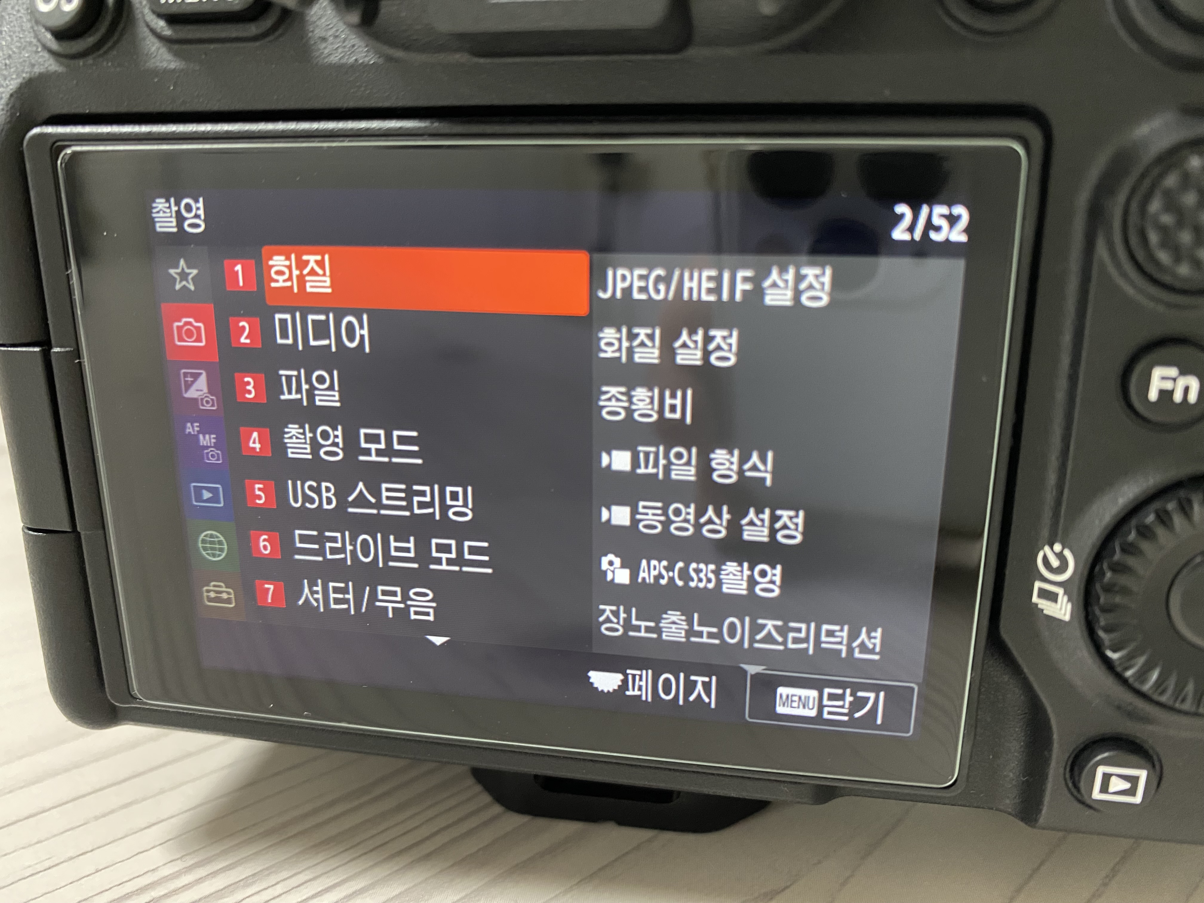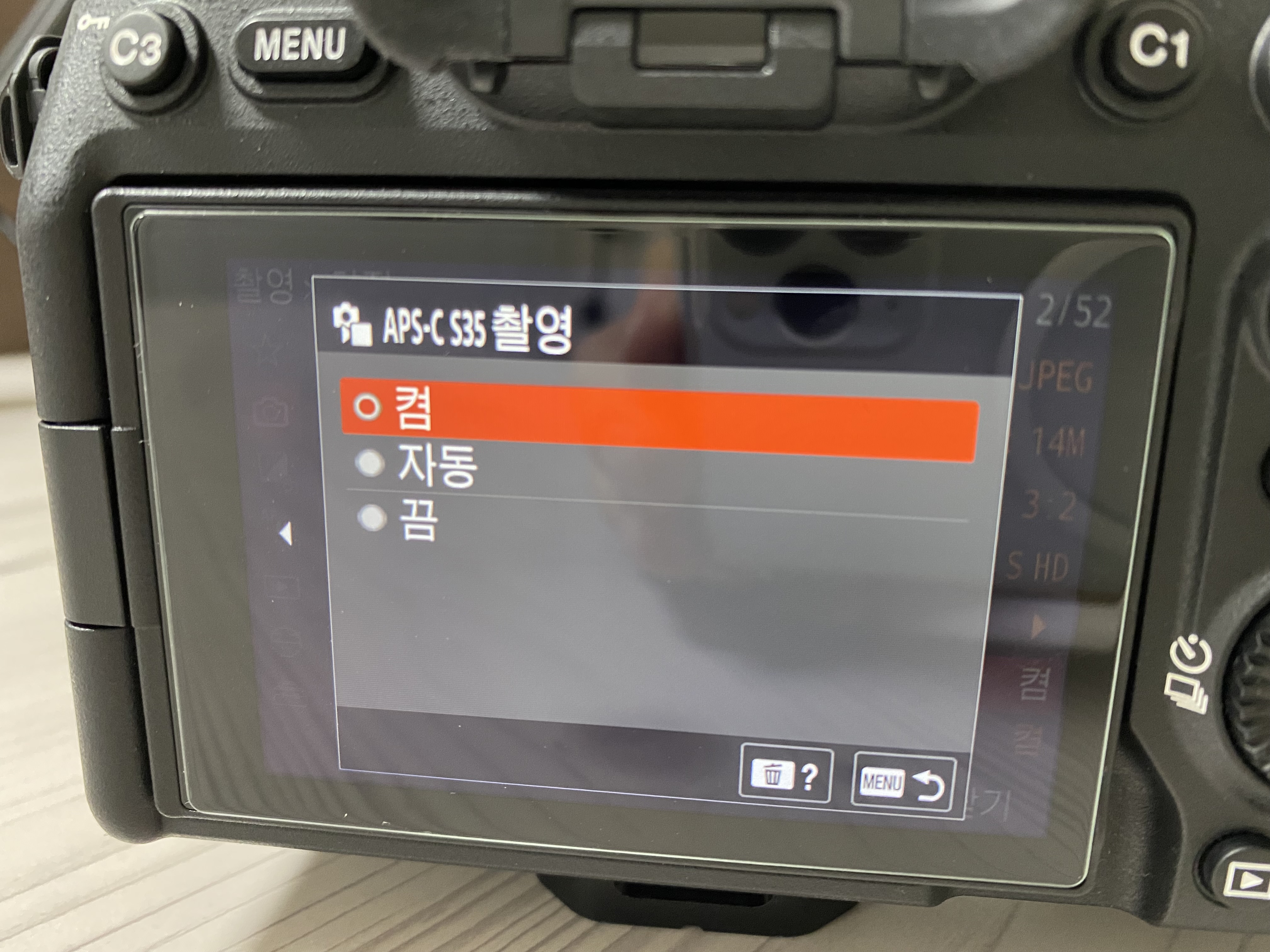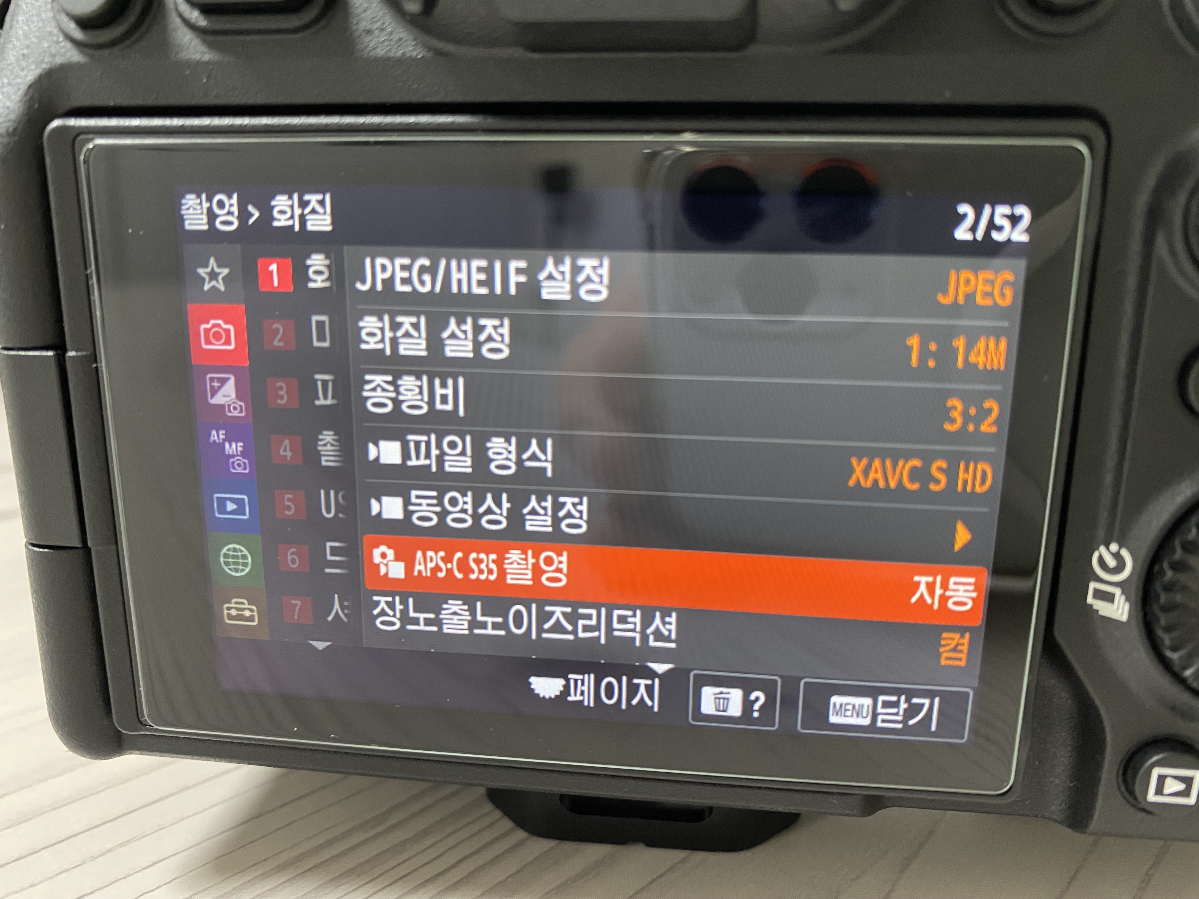 MENU > (촬영) > [화질] >APS-C S35 촬영 > 자동에서 '켬' 으로 변경