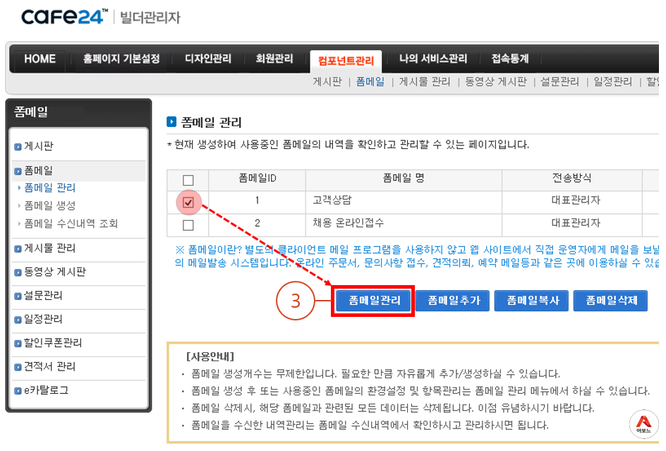 3. 해당 폼메일을 체크 선택한 후 "폼메일관리"를 클릭합니다.
