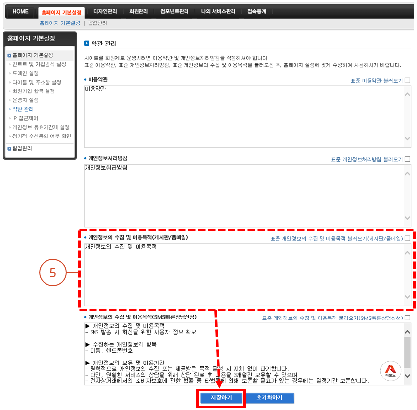 5. 그럼, "개인정보의 수집 및 이용목적(게시판/폼메일)" 부분에 내용을 입력 후 "저장하기"를 클릭합니다. (ps. 참고로 우측 부분에 네모 체크 부분을 체크하면 표준 약관 내용이 나타납니다.)