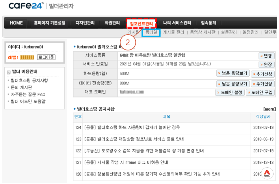 2. 상단 메뉴 "컴포넌트관리-폼메일" 클릭합니다.