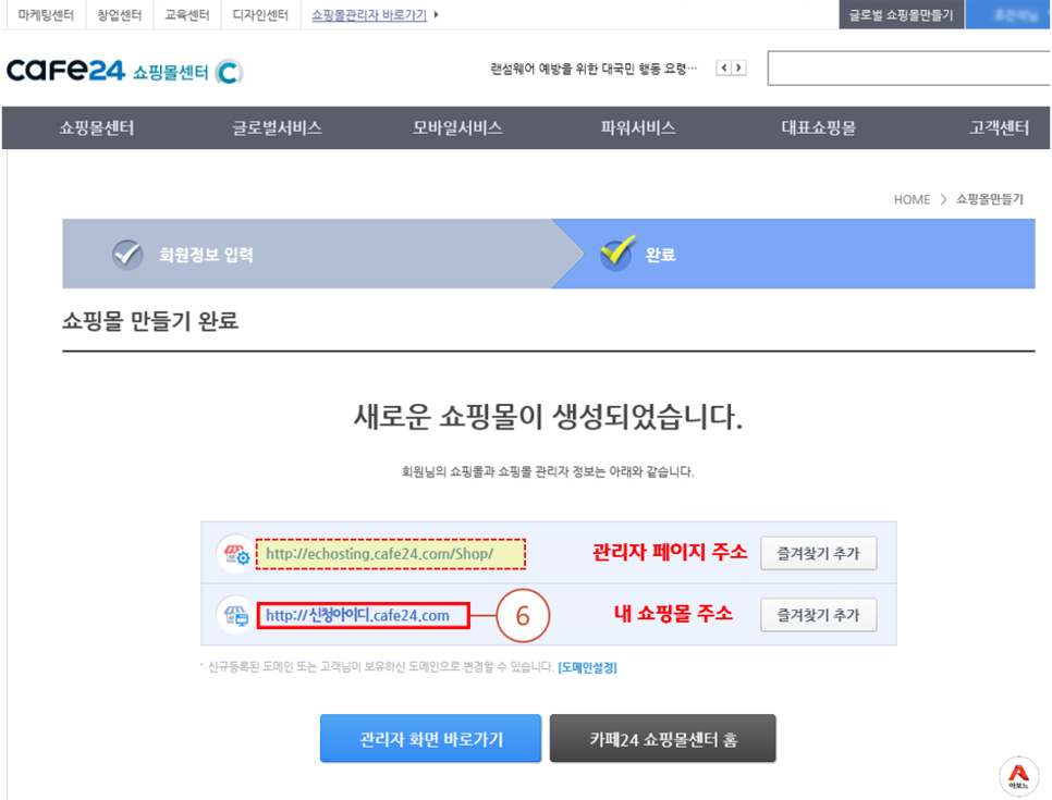 내 쇼핑몰 주소 : http://신청아이디.cafe24.com - 예시) http://aboneu.cafe24.com