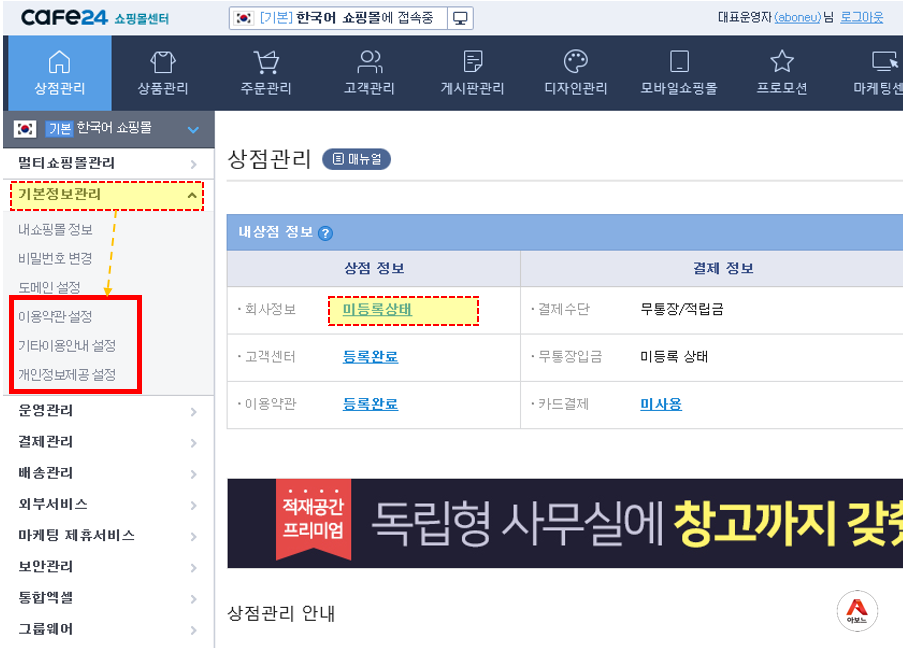 p.s) "내 쇼핑몰 정보" 뿐만 아니라 추가적으로 아래 페이지들 정보도 입력해주면 좋습니다.