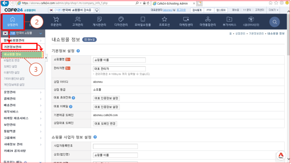 3. 왼쪽 메뉴에서 기본정보관리 클릭 > "내 쇼핑몰 정보"를 클릭합니다.