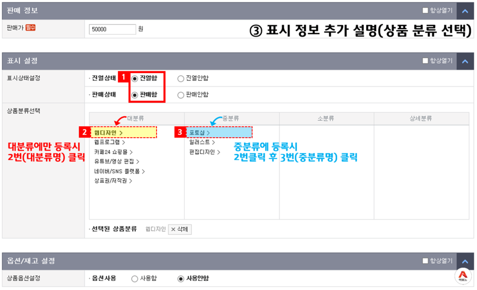 ③ 표시 정보 추가 설명입니다. (대분류 or 중분류 선택 진열 방법입니다.)