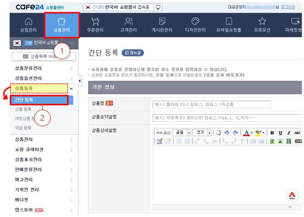 2. 좌측 메뉴 - 상품등록 클릭 후 "간단 등록" 클릭