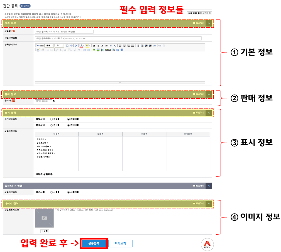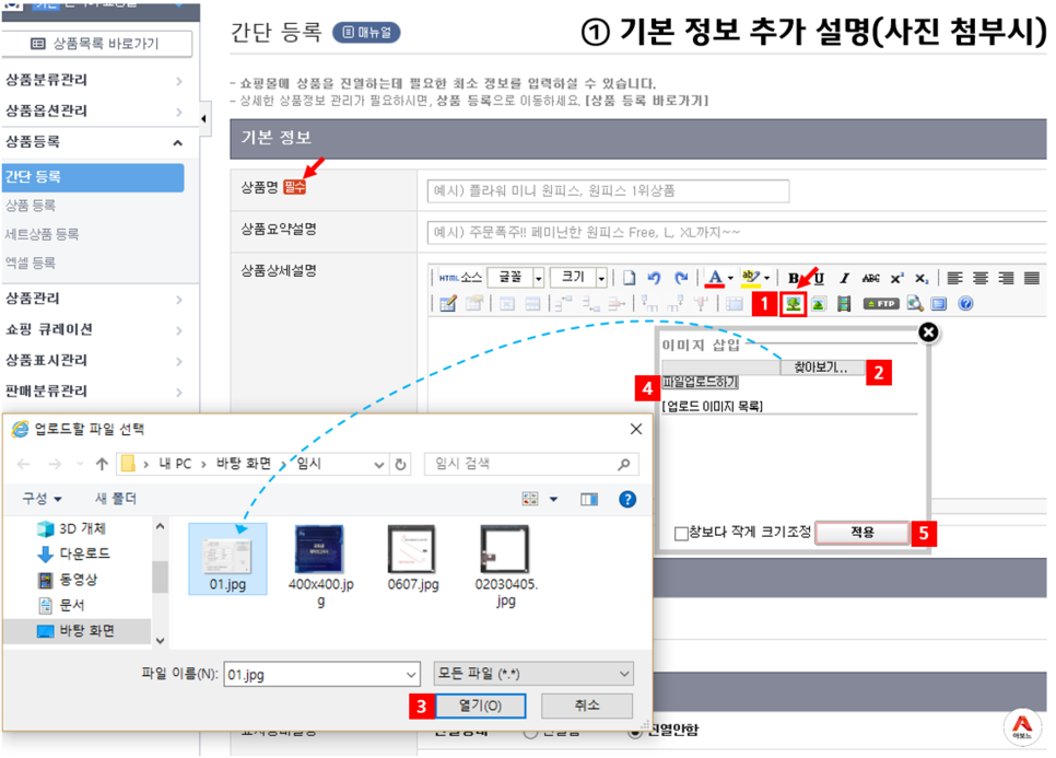 ① 기본 정보 추가 설명입니다. (상품상세설명에 이미지 사진 첨부 방법입니다.)