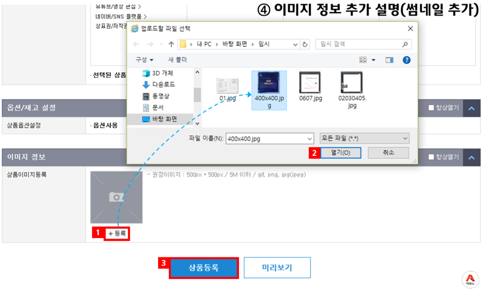 ④ 이미지 정보 추가 설명입니다. (상품 리스트페이지에 보여질 "썸네일 사진"입니다.)