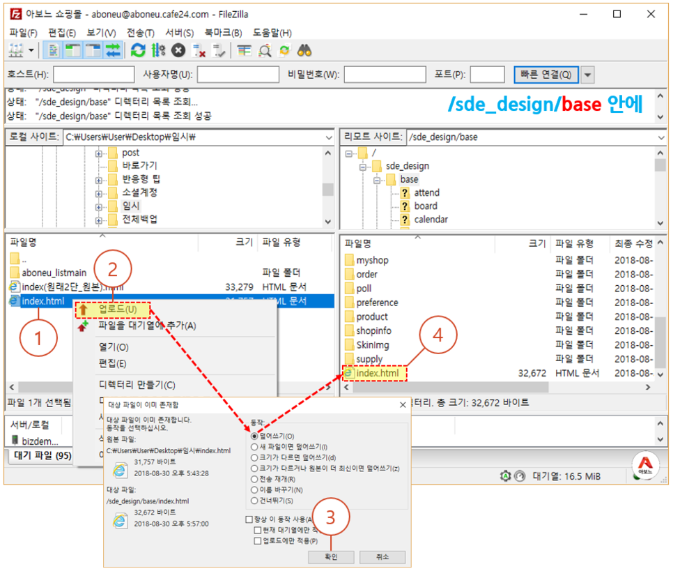 3단계 : index.html 파일 업로드하여 "덮어쓰기 교체" 하기