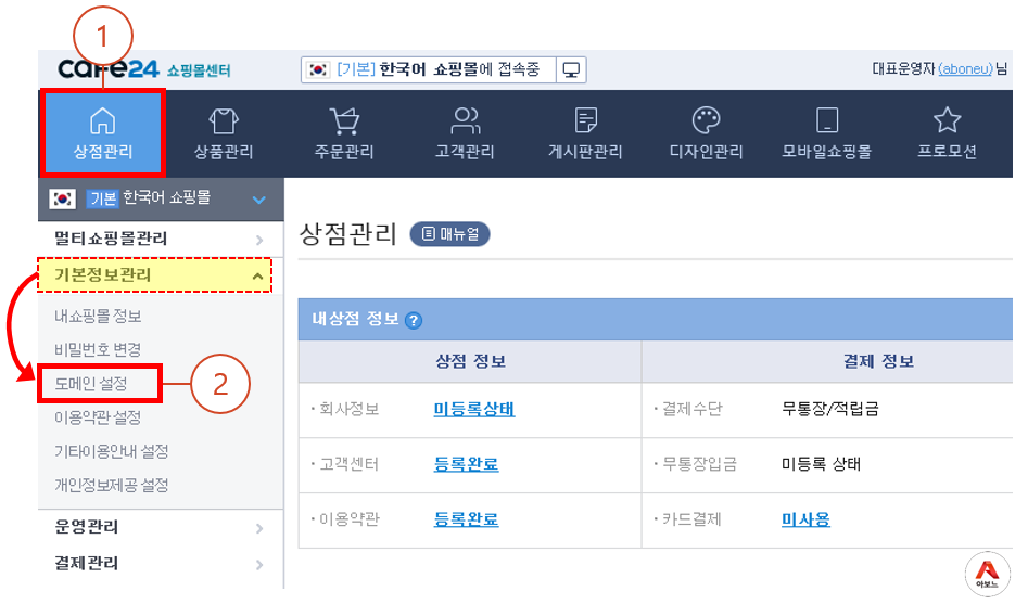 2. 좌측 메뉴 '기본정보관리' 클릭 후 "도메인 설정" 클릭