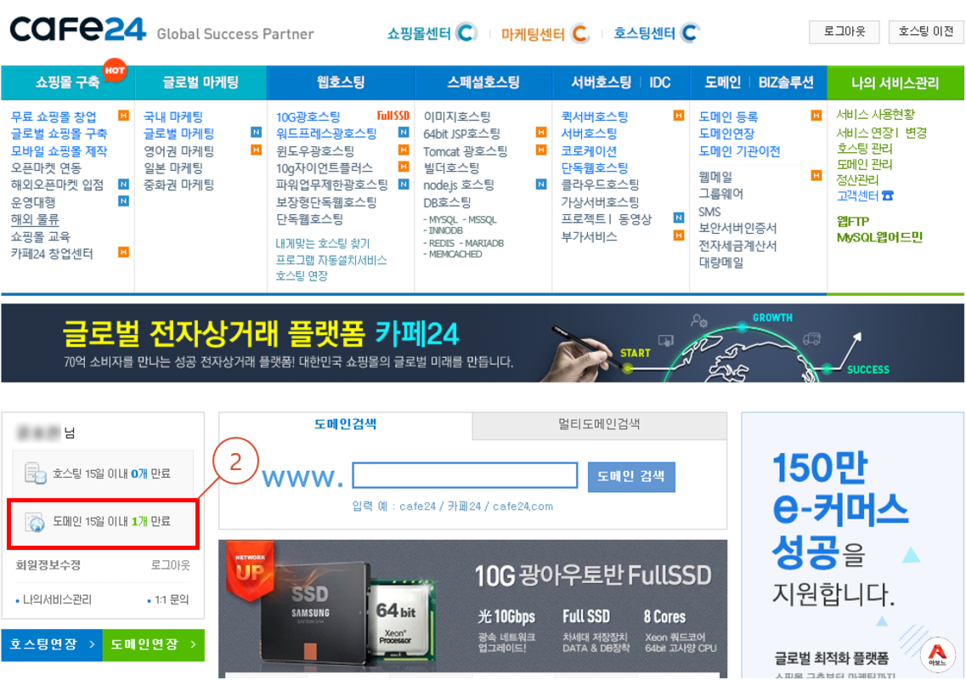2. 로그인하면, 도메인 15일 이내 1개 만료라고 표시된 부분이 있습니다. "1개" 글자를 클릭합니다!