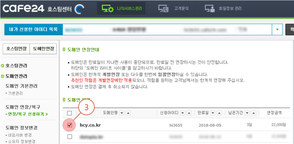 3. 해당 도메인이 3일 남은 걸 볼 수 있습니다. 도메인 앞 부분에 체크를 합니다.