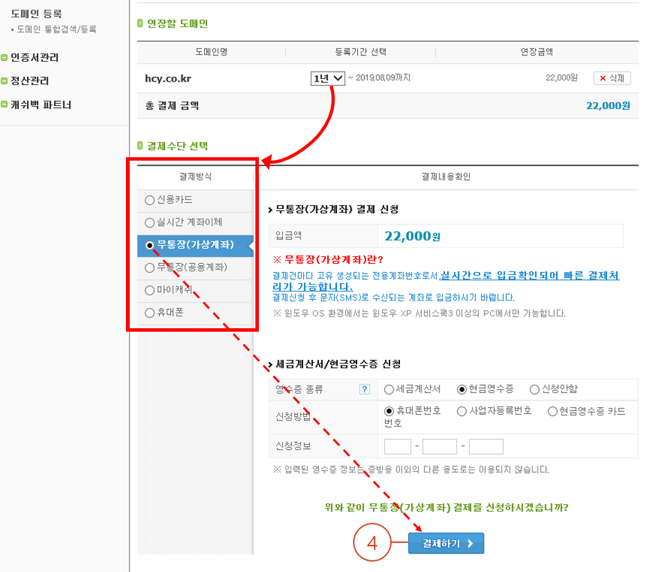 5. 결제정보 확인을 하시고 "확인"을 클릭합니다. (보통 1년 도메인 연장비는 평균 22,000원입니다.)