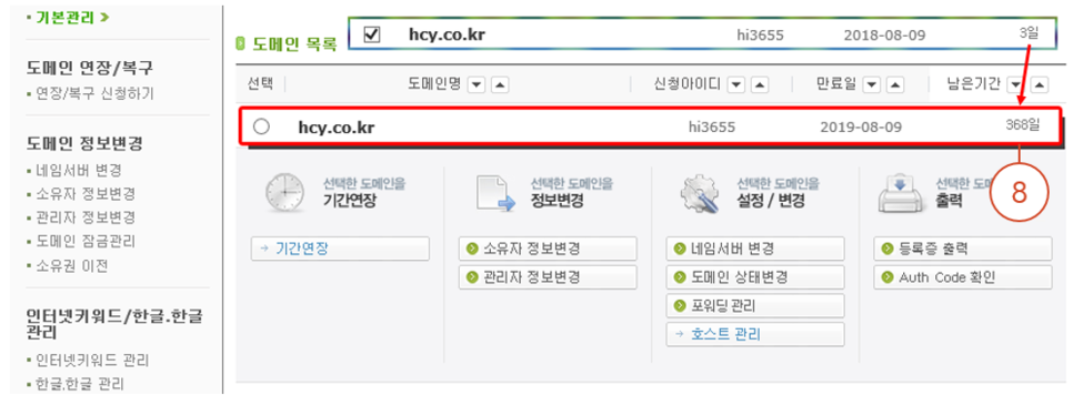8. 최종적으로 도메인 남은 기간이 3일에서 → 368일로 변경된 것이 확인됩니다.