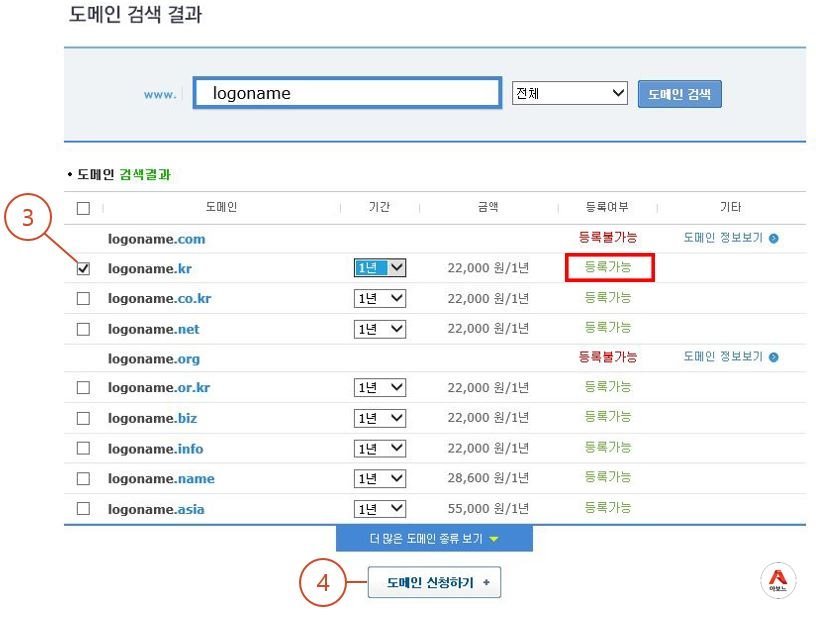 3. 등록가능이라고 표시된 도메인만 구입가능합니다. 원하는 도메인 체크하기!