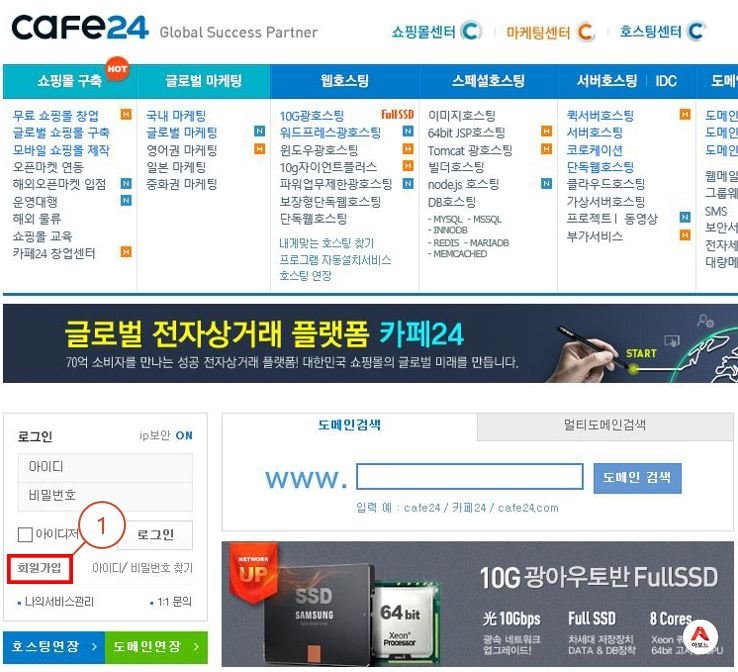 1. https://www.cafe24.com/ 카페24 사이트에 접속 후 "회원가입" 후 로그인 합니다.