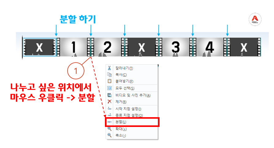 분할은 해당 위치 부분에서 영상을 나눈다고 생각하면 됩니다.