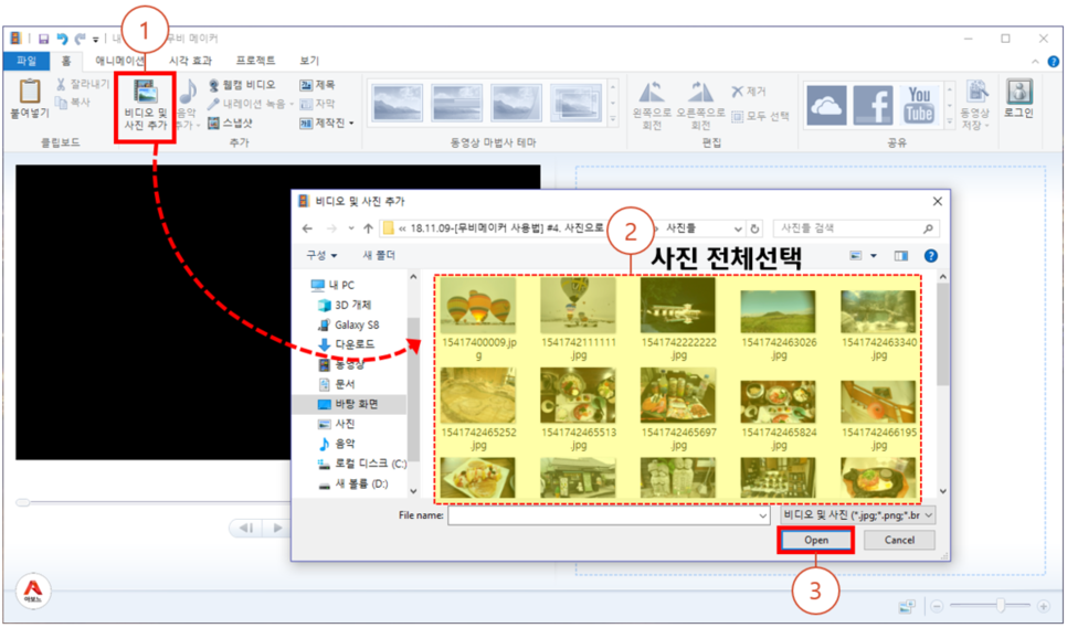 1. 상단 메뉴 "비디오 및 사진 추가" 클릭