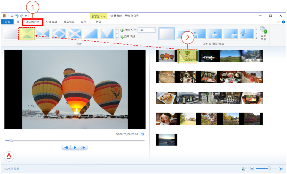 2. 작업 창에 사진 차례대로 선택 → 화면 전환 효과 선택