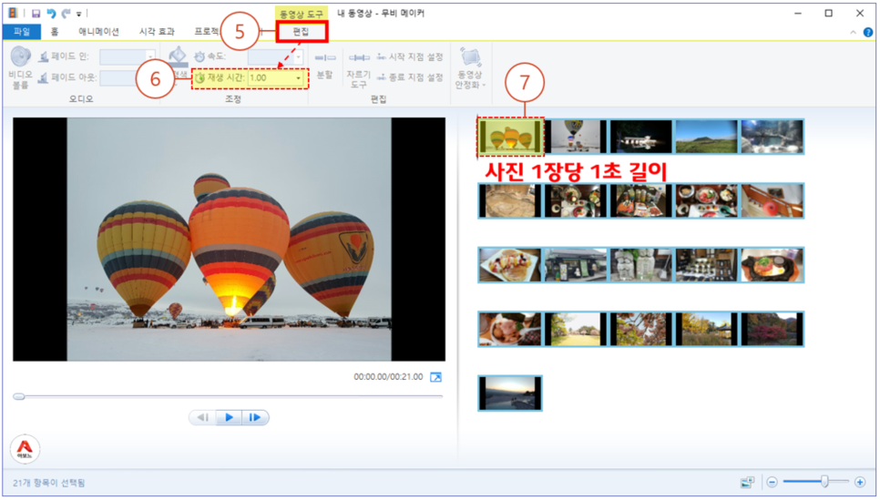 그런데.. 사진 1장당 7초의 재생 시간이 잡힙니다. (재생 시간 변경 필요!)