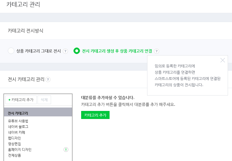 4. 스마트스토어관리 > 카테고리 관리 > 전시 카테고리 생성 후 상품 카테고리 연결 방법