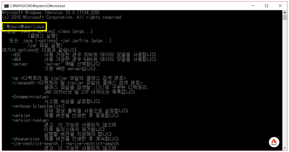 열린 커맨드창에서 java를 치면 아래처럼 나오면 정상 연결된 상태입니다.