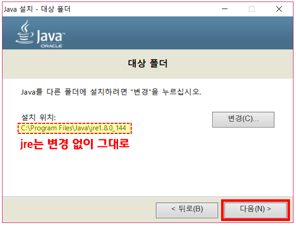 jre 설치는 경로 변경 없이 그대로 "다음" 진행합니다.