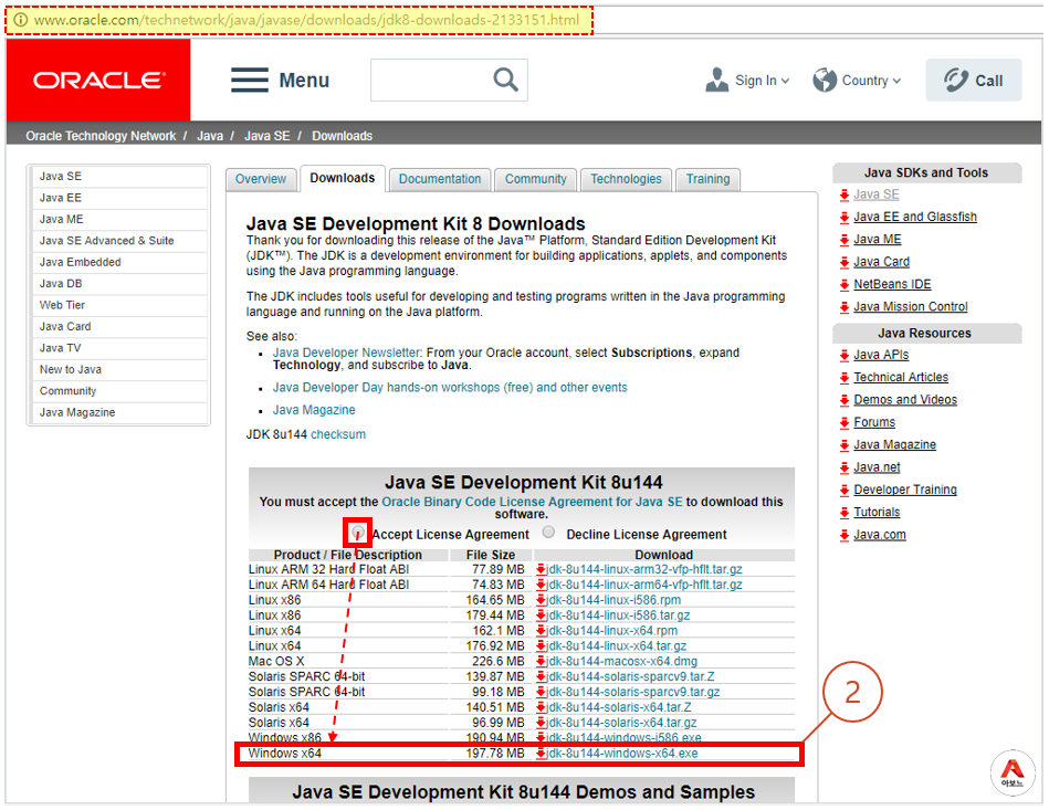 1-2. 여기선 jdk-8u 144-windows-x64.exe 파일을 다운 받아 설치하겠습니다.