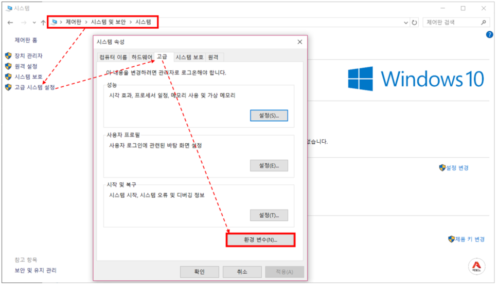 "고급 시스템 설정" 클릭 후 "고급" 탭을 클릭