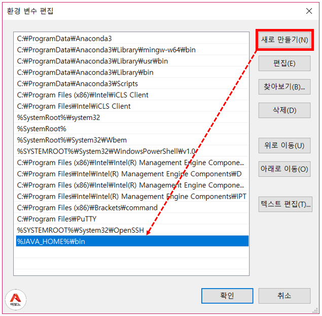 2-7. 새로 추가한 %JAVA_HOME%\bin 을 젤 위로 이동시킵니다.