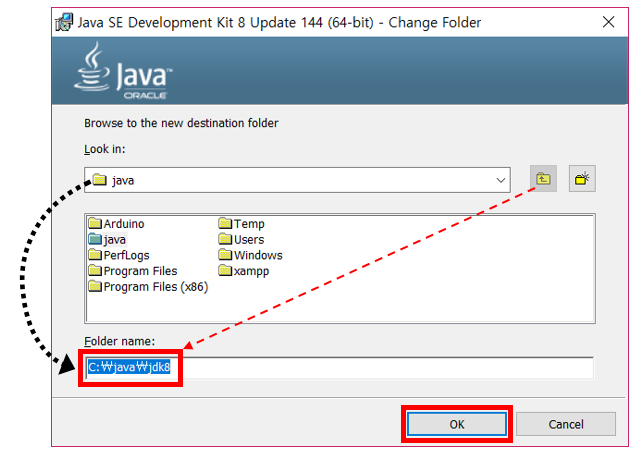 C:\java로 선택한 후에 jdk8폴더 이름을 붙이고 OK를 클릭합니다.