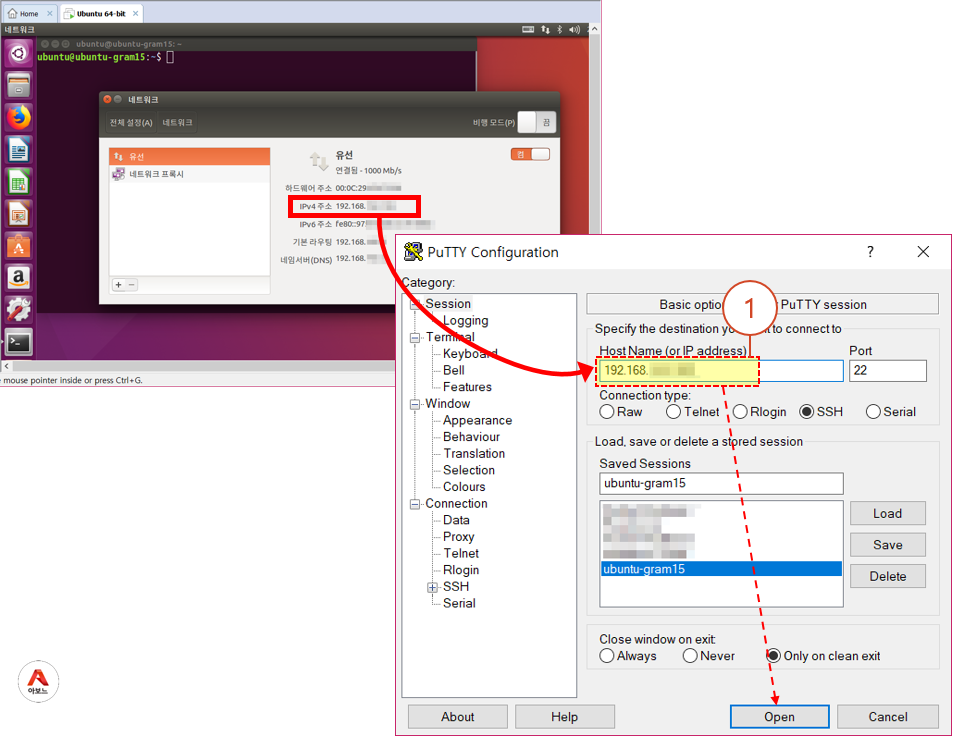 1. 우분투 실행 후 PuTTY접속 → IP주소 입력후 Open클릭