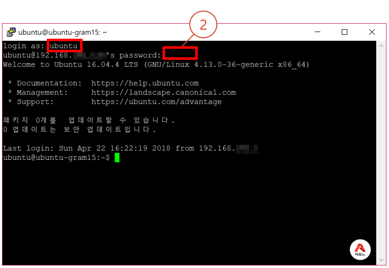 2. putty접속 창에서 아이디/비번 입력 후 우분투에 접속