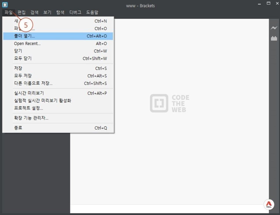 5. 이제 브라켓을 열고 "파일" -> "폴더 열기" 를 해서 프로젝트 폴더를 선택합니다.