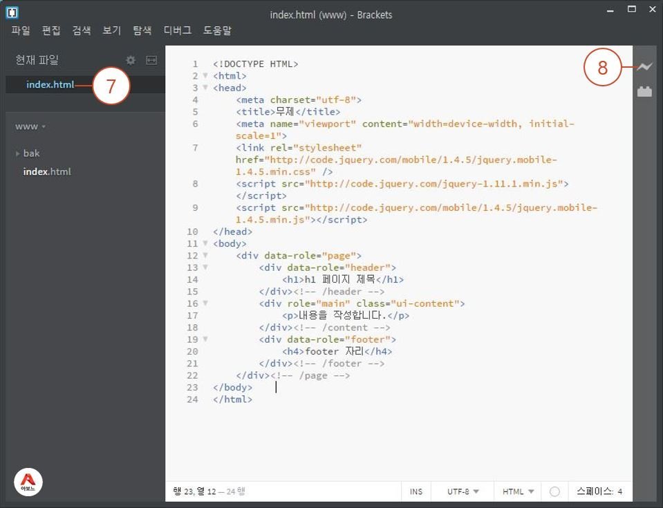 7. index.html 을 열어나 새로 만들기해서 본문 테스트 소스를 작성합니다.