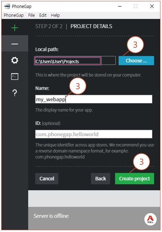 3. 폰갭 프로젝트 정보 입력 부분에서