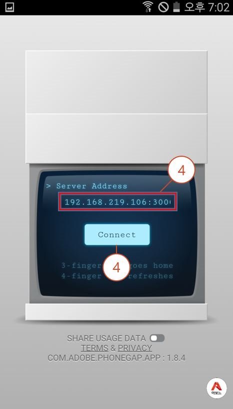 4. 폰갭 디벨로퍼 앱 실행 화면 가운데 'Server Address' 부분에 2번에서 메모한 ip주소를 입력합니다.