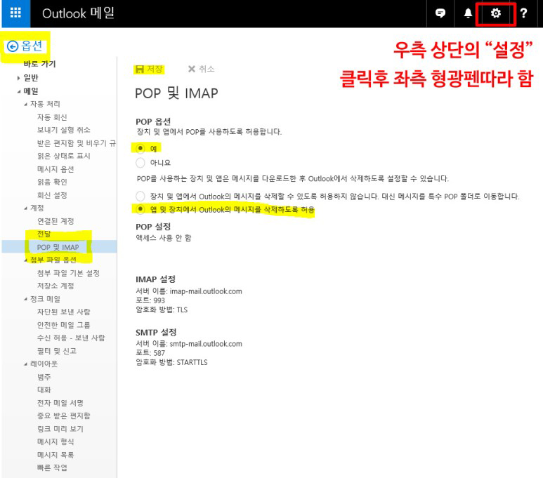 좌측 메뉴에서 "옵션" 안에 > 메일 > 계정 > POP 및 IMAP 클릭 후