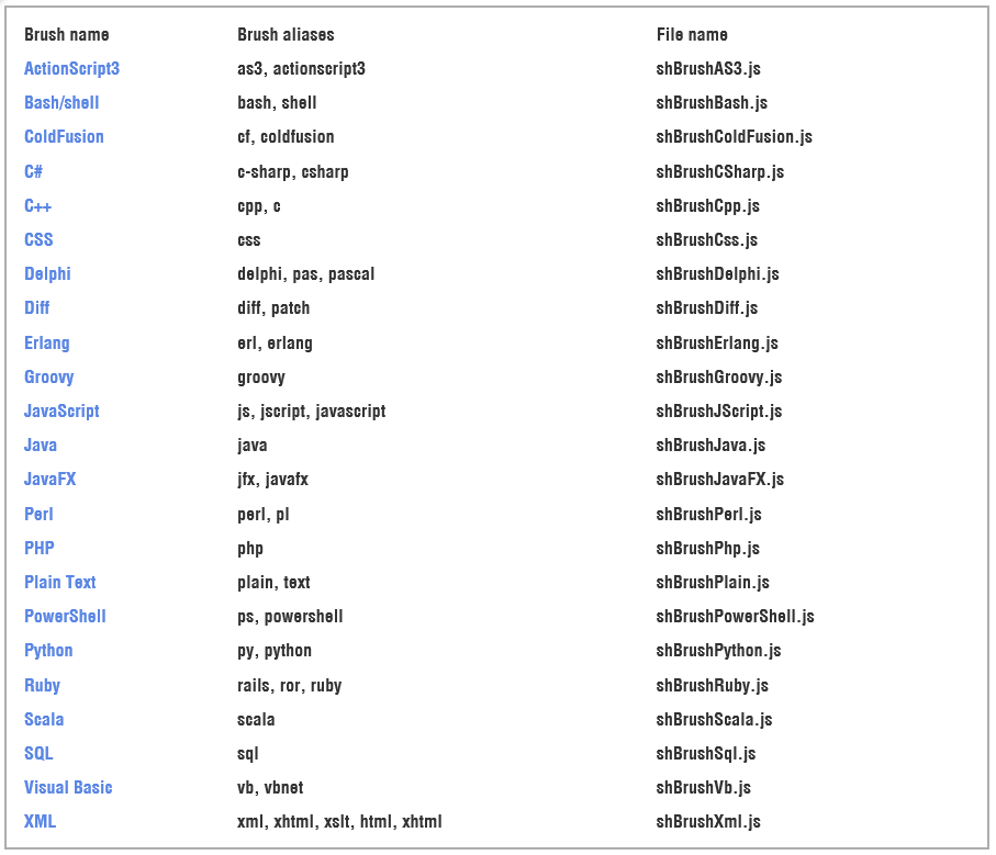 http://alexgorbatchev.com/SyntaxHighlighter/manual/brushes/