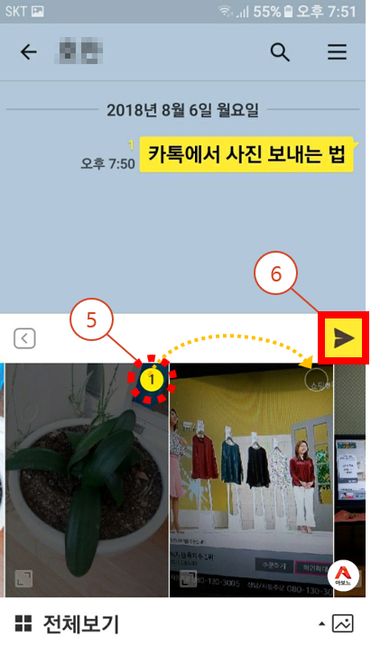 6. 사진을 선택했다면 종이비행기 모양 아이콘을 클릭하면 전송됩니다.