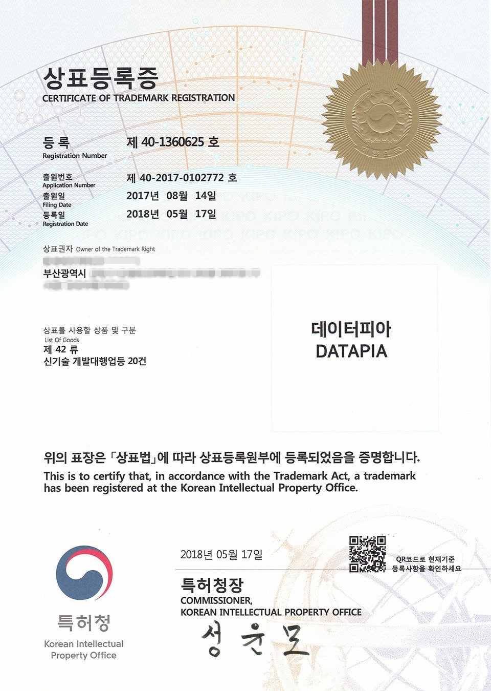 1. "데이터피아 DATAPIA" 란 상표명으로 상품분류 : 42류에 최종 등록 완료한 사례입니다.