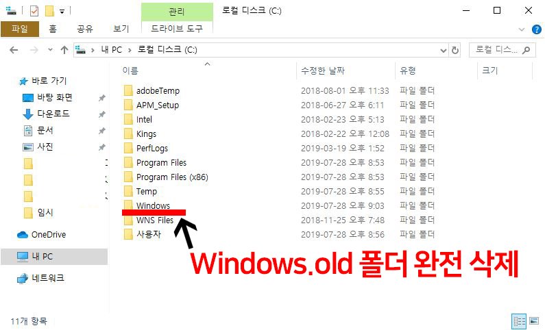 4. 이 단계가 오래된 윈도우 폴더를 삭제하는 과정입니다.