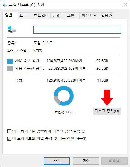 2. 속성 창에서 "디스크 정리" 를 클릭합니다.