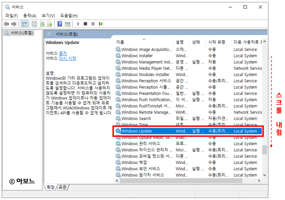 2. 서비스 창에서 스크롤을 아래로 내리면