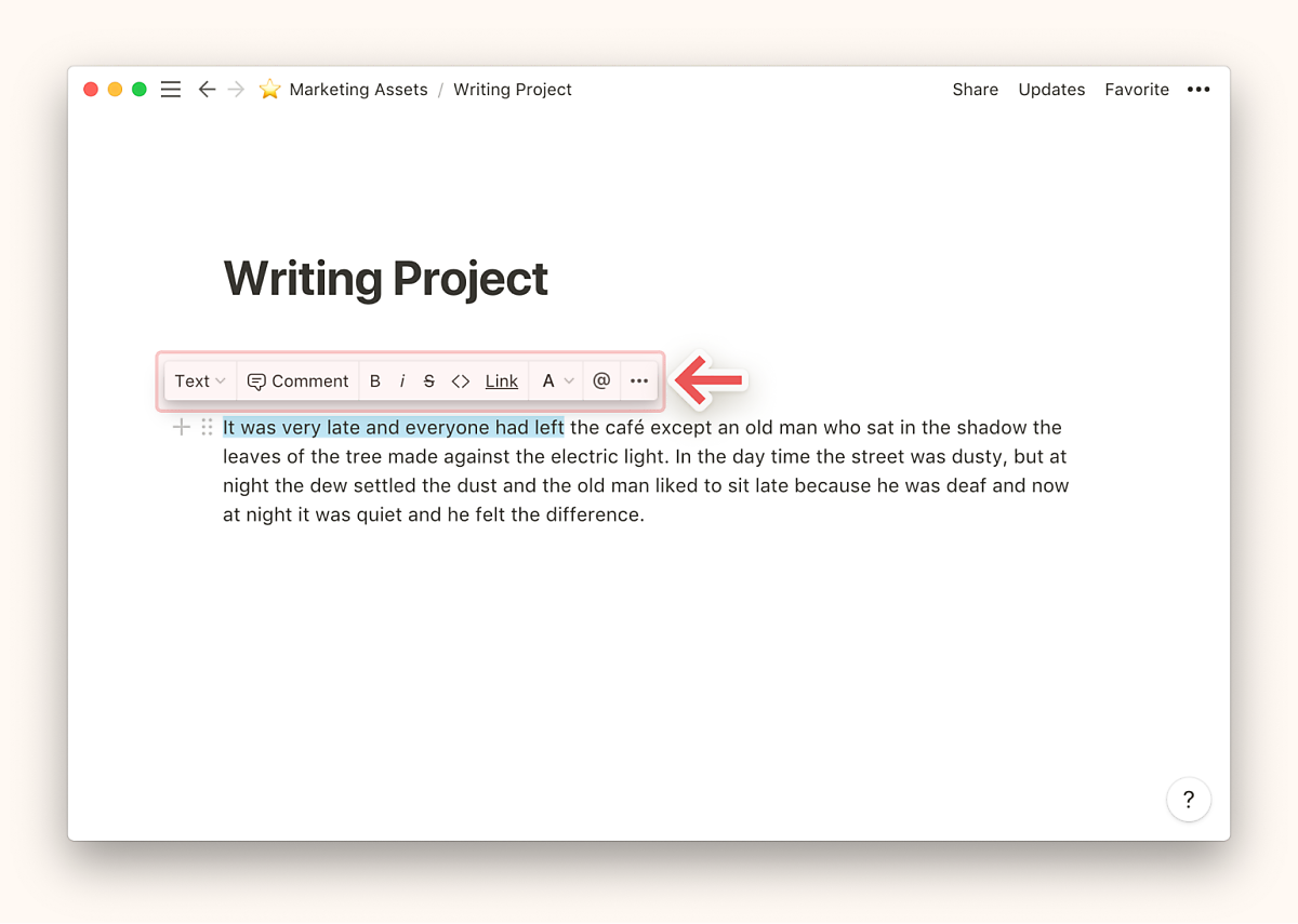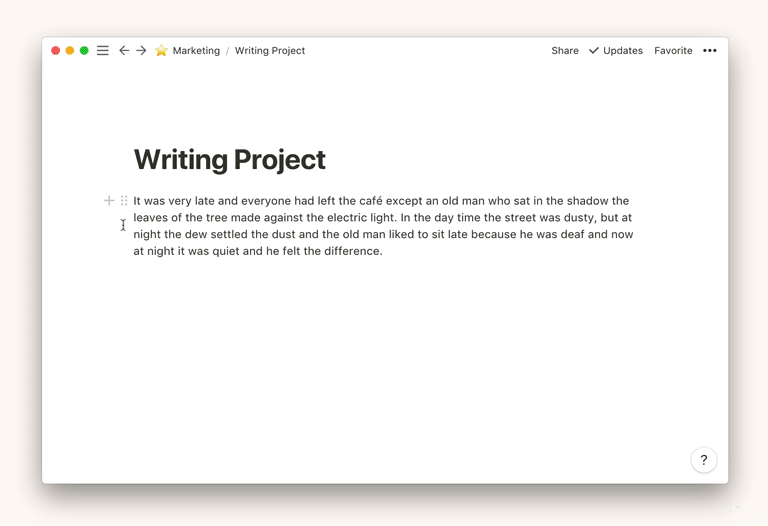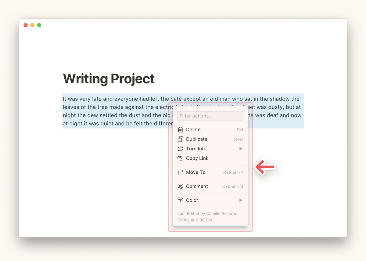 Turn Into 옵션을 사용하면 블록을 다른 유형의 블록으로 변환할 수 있습니다. 예를 들어,이 텍스트 블록을 따옴표 블록으로 바꾸는 방법은 다음과 같습니다: