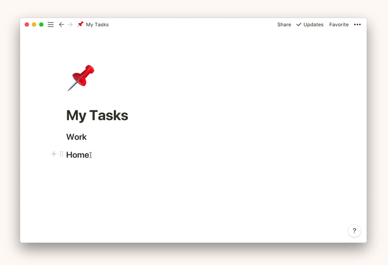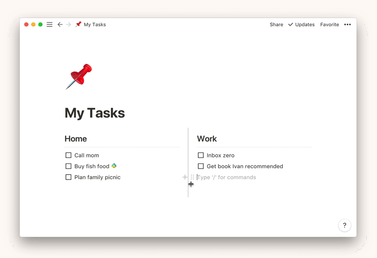 Notion의 모든 항목은 끌어서 놓기로 이동할 수 있습니다. 마우스 커서를 가져 가면 블록 왼쪽에 표시되는 **⋮⋮** 아이콘을 클릭 한 상태로 유지하면 드래그 할 수 있습니다!